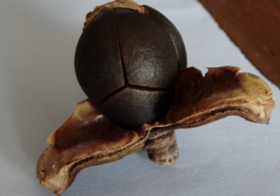 ■画像06 :20251102ツバキ 画像は殻が割れて種子が現れている状態。種子は1つの殻 に最大9個の種子が入っていますが、それぞれの形も異なり通常は5,6個が凹凸を組み合わせ上手く入っております。画像は1つの実に見えますが各種子が組み合わさった形です。種子の用途も幅広く利用されております |